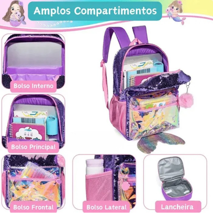 Mochila Infantil para Meninas Super Shine Com Lantejoulas + Estojo e Lancheira de Brinde