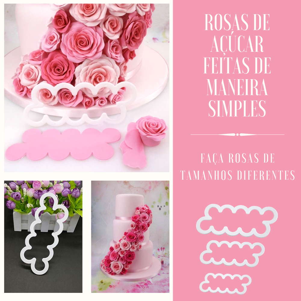 O kit vem com 3 tamanhos diferentes de cortadores que são facilmente retirados e formam rosas para bolos, cupcakes e outros doces. Podem ser usados com pasta americana, fondant, glacê real, goma, marzipan e até mesmo, argila. Proporciona uma solução divertida e rápida com uma finalização profissional para seus bolos deliciosos!