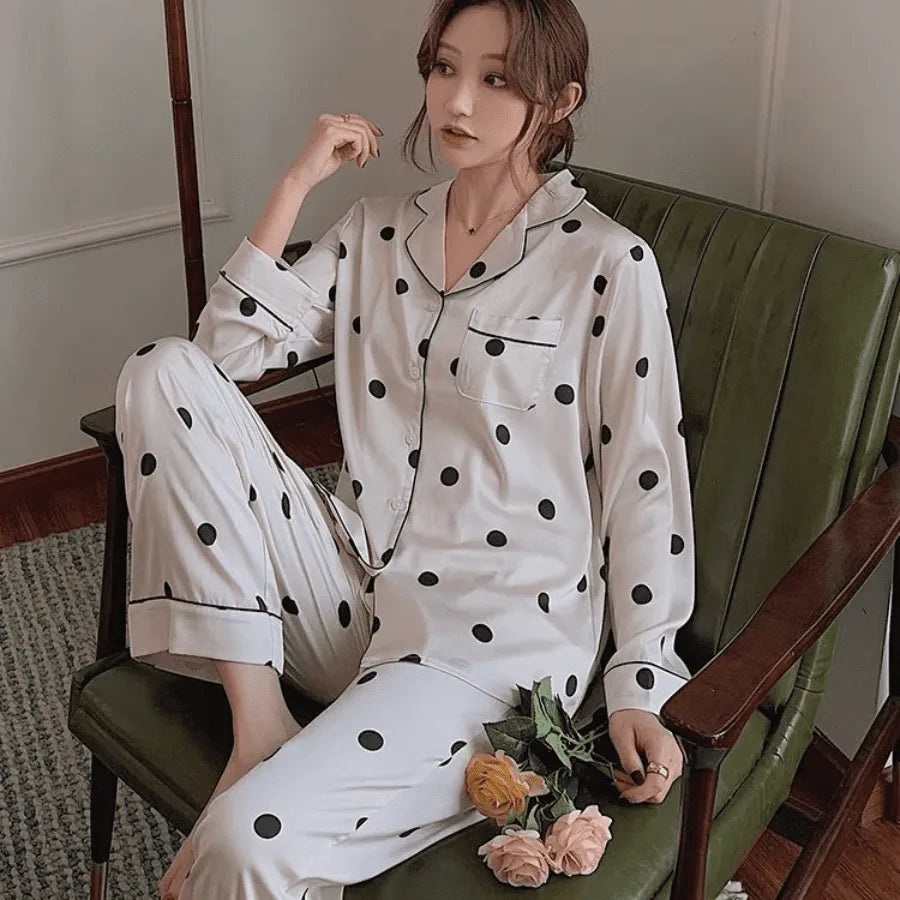 Cada peça do Pijama Feminino Serenade é cuidadosamente desenhada para garantir que você se sinta Bela e Confortável. Com uma gola V que valoriza o seu Pescoço, o conjunto é estampado com padrões encantadores de Flores, Coelhos, Bolinhas Pretas, Cerejas, além de opções Prateadas e Douradas. Este design não apenas exala Charme e Delicadeza, mas também adiciona um toque de Alegria e Elegância ao seu Vestuário Noturno. Não perca a chance de adicionar um toque de luxo e estilo às suas noites com o Pijama Feminino Serenade!