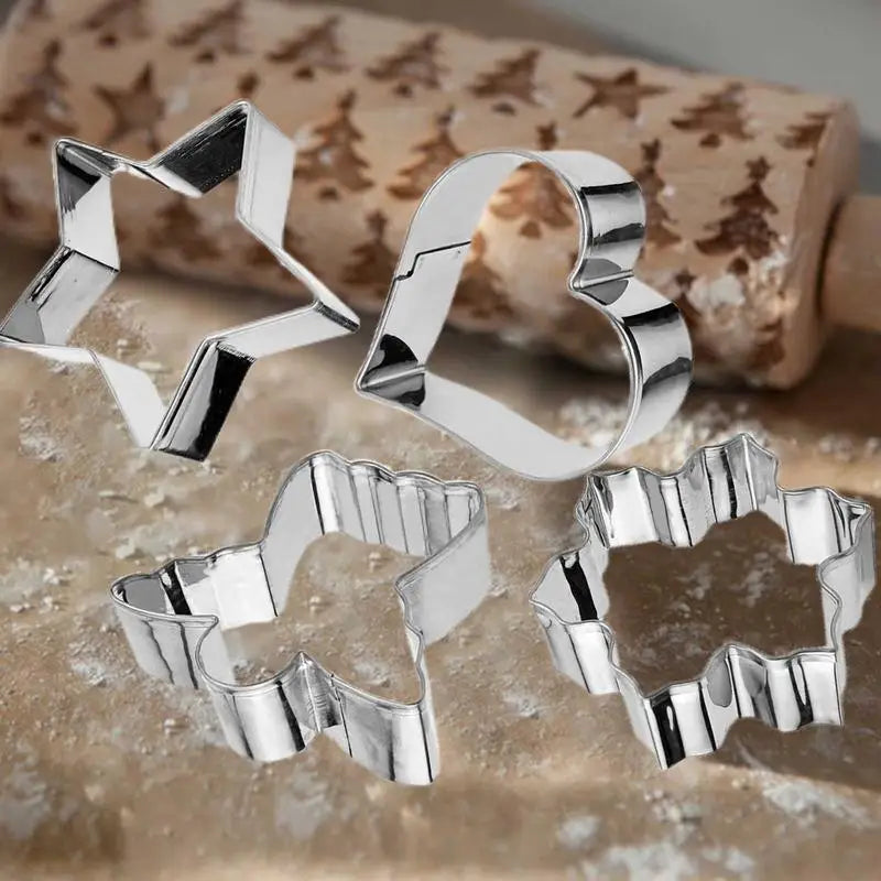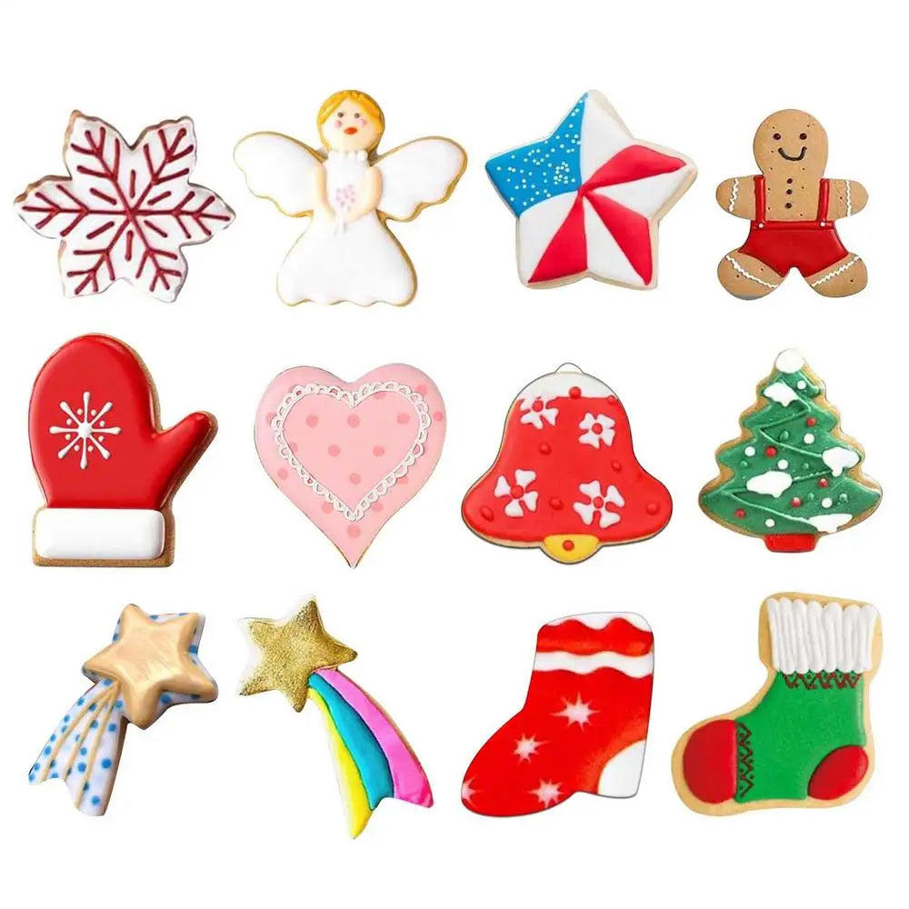 - 12 cortadores de biscoitos com formatos natalinos: anjos, árvores de Natal, meias, homens de gengibre, flocos de neve, estrelas, luvas, corações e sinos.