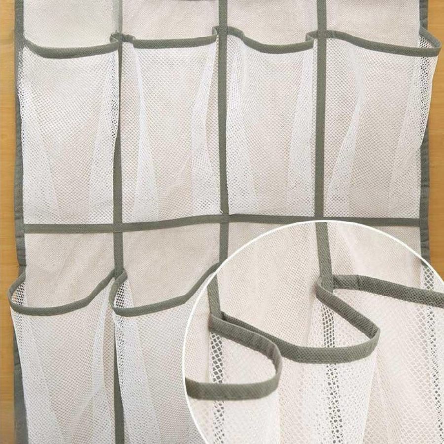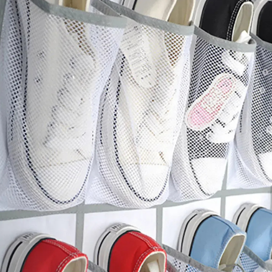 - 24 bolsos de malha forte transparente, organizam até 12 pares de sapatos