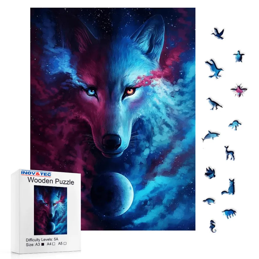 Quebra-Cabeça De Madeira Inova WOOD PUZZLE - Lobo Na Galáxia | Diversão Com Diversos Benefícios Para Crianças e Idosos