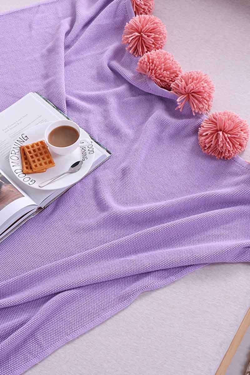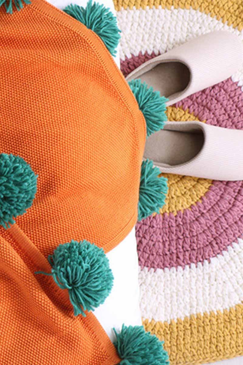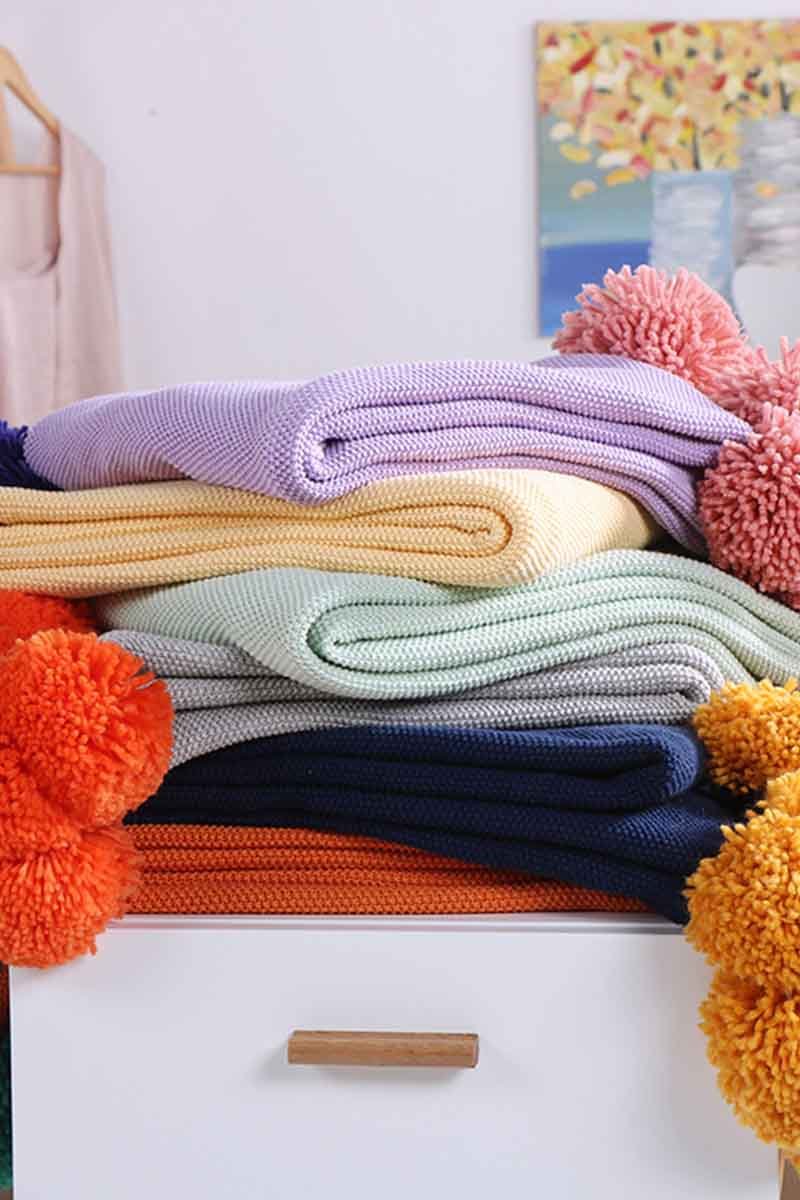 Cobertor feito de algodão, com cores vibrantes e pompons na barra, apresentando contraste.