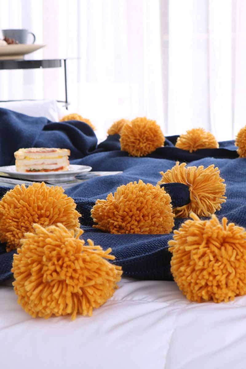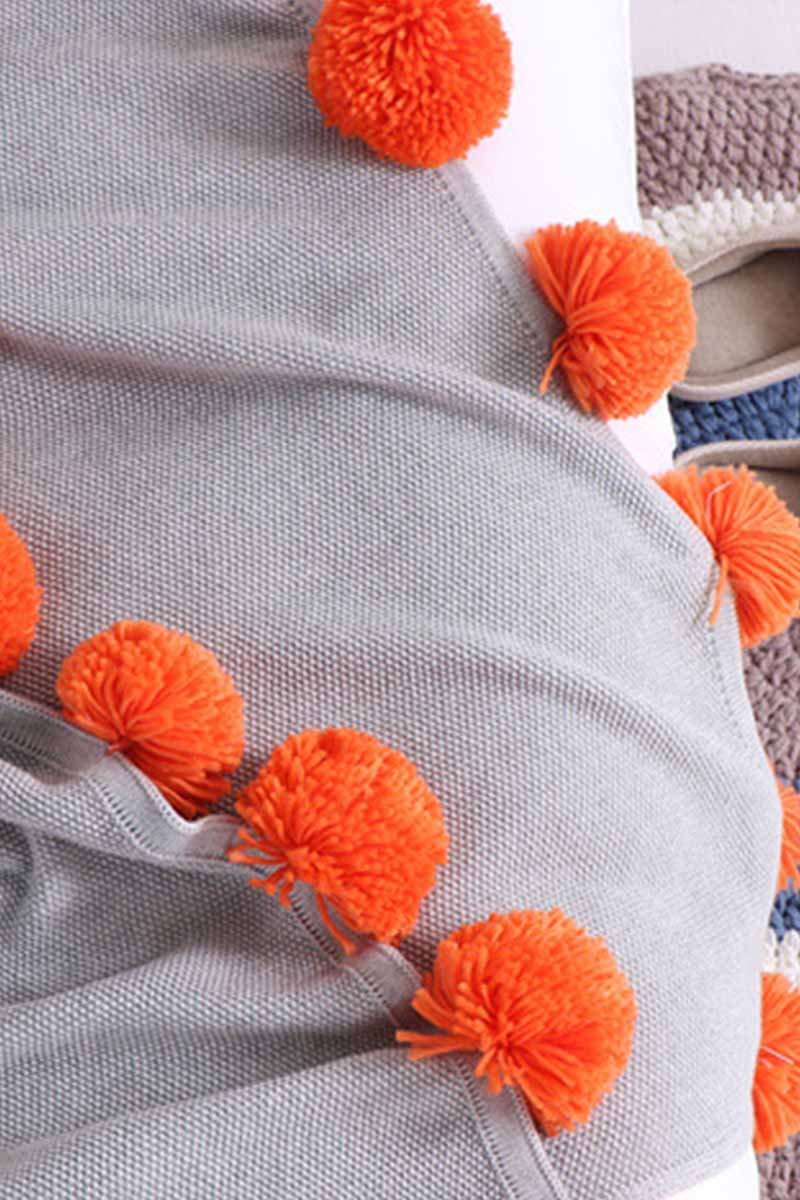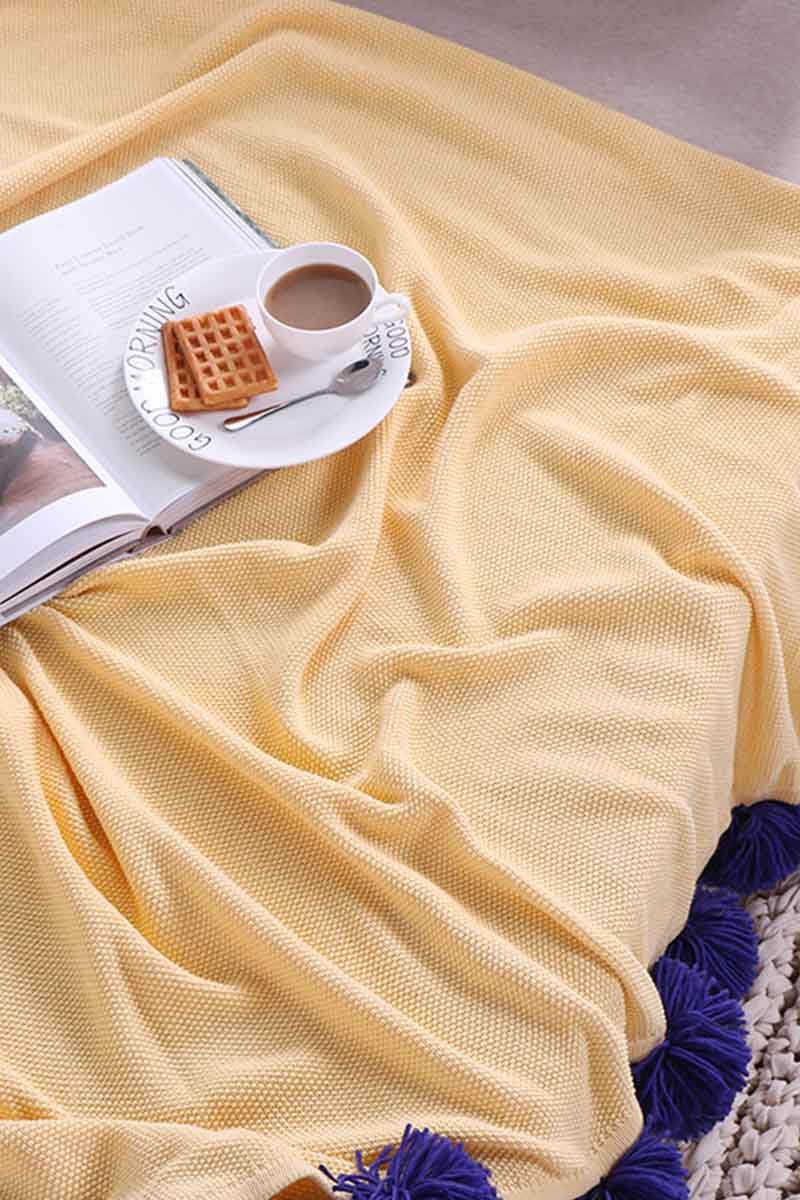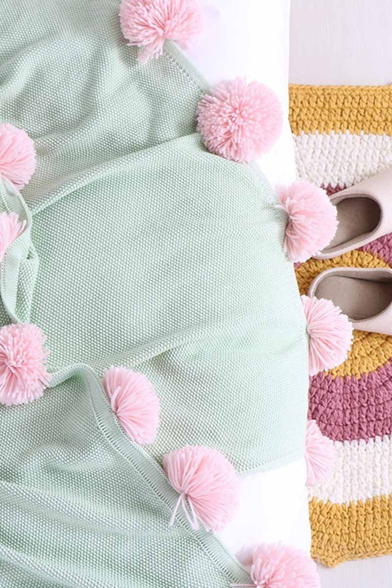 Cobertor feito de algodão, com cores vibrantes e pompons na barra, apresentando contraste.
