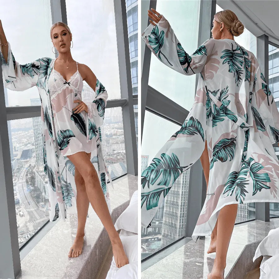Pijama Feminino Selvage Conjunto Camisola e Roupão Em Cetim Seda Premium Com Detalhes De Renda | Toque De Seda Confortável