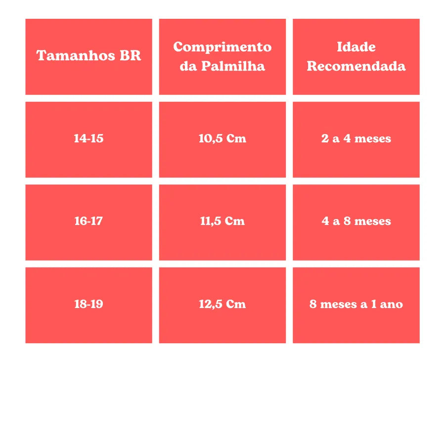 O tamanho padrão pode variar de acordo com a marca. Por esse motivo, recomendamos que você faça a medição do pezinho do bebê conforme as instruções e compre de acordo com o tamanho da palmilha para evitar problemas de trocas e devoluções.