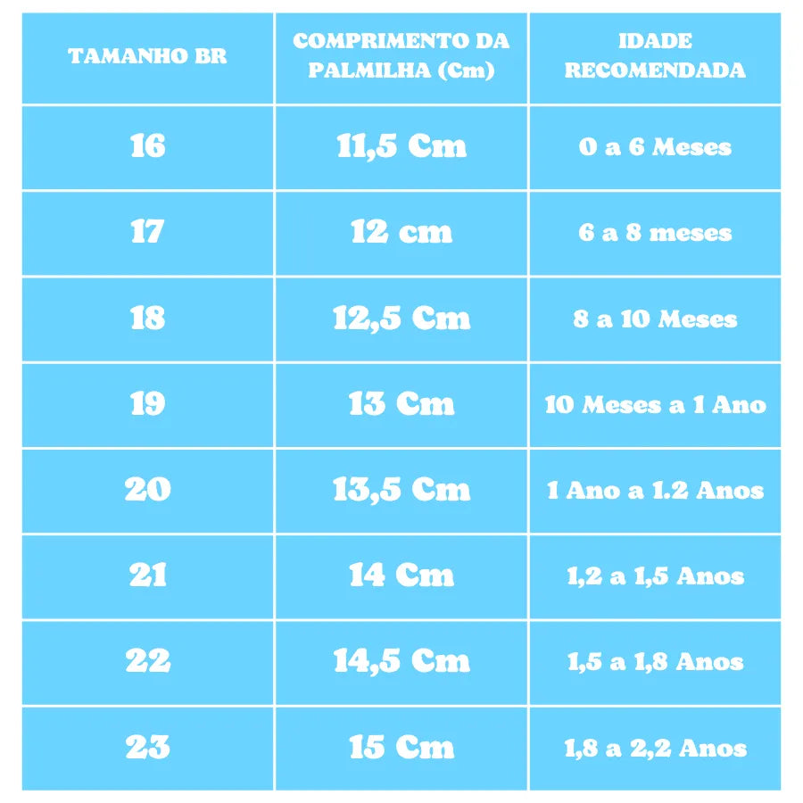 Tamanho - Comprimento da Palmilha (Cm): 16 (11.5cm) - 0 a 6 Meses