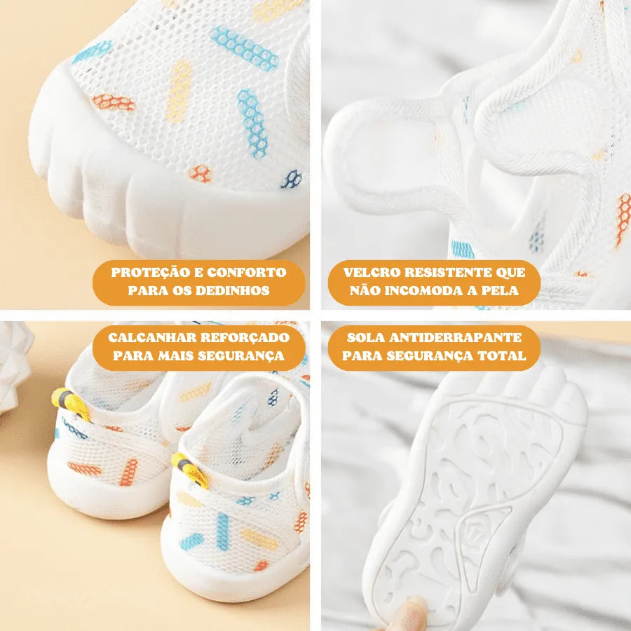 Nossa sola antiderrapante oferece aderência e estabilidade, permitindo que seu bebê dê seus primeiros passinhos com segurança. Proteção para os dedos, evitando machucados.