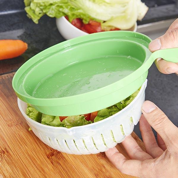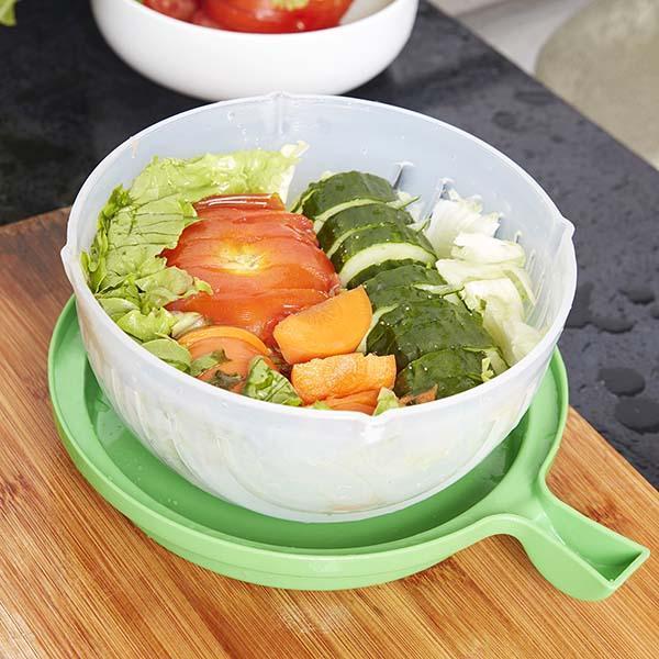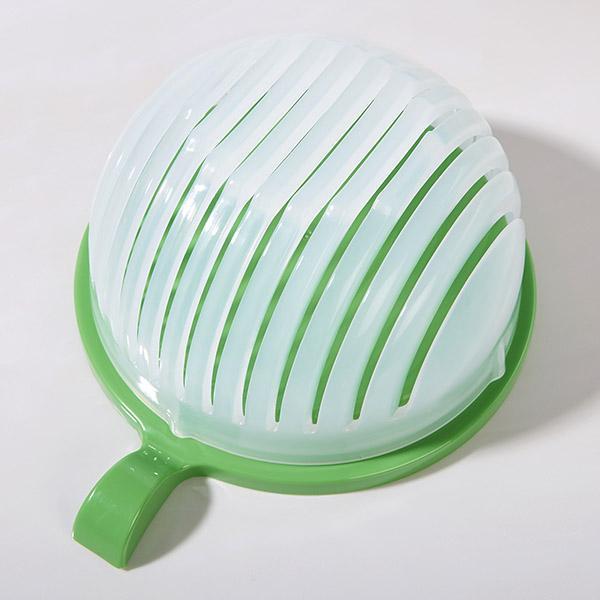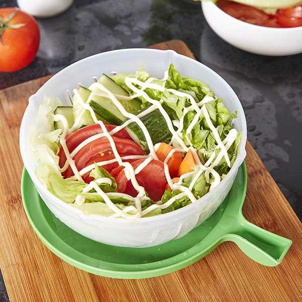 É saudável comer sempre a sua resolução de Ano Novo? Este Cortador de Salada irá ajudá-lo a comer mais salada com pouco esforço! Simplesmente coloque seus ingredientes na tigela, cubra-os e corte-os! Você poderá desfrutar de sua salada fresca e uniforme em menos de um minuto. Coma mais vegetais!