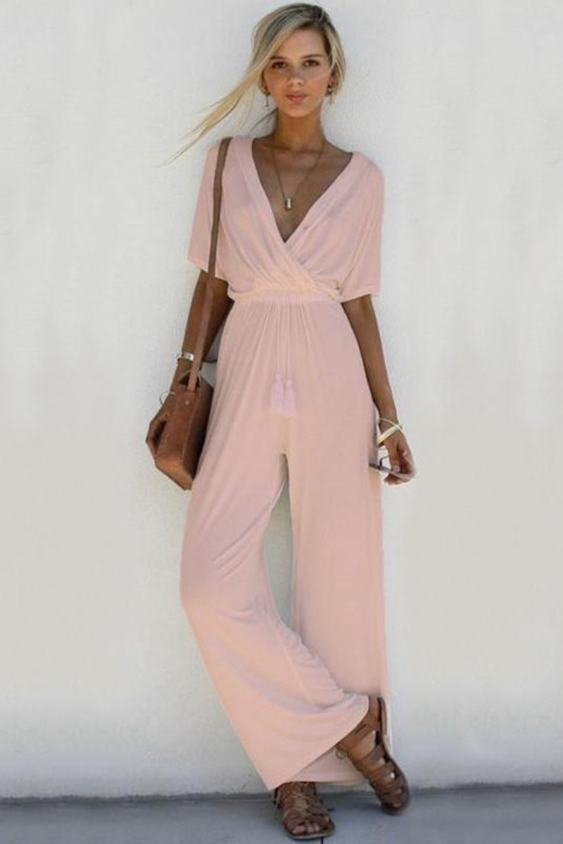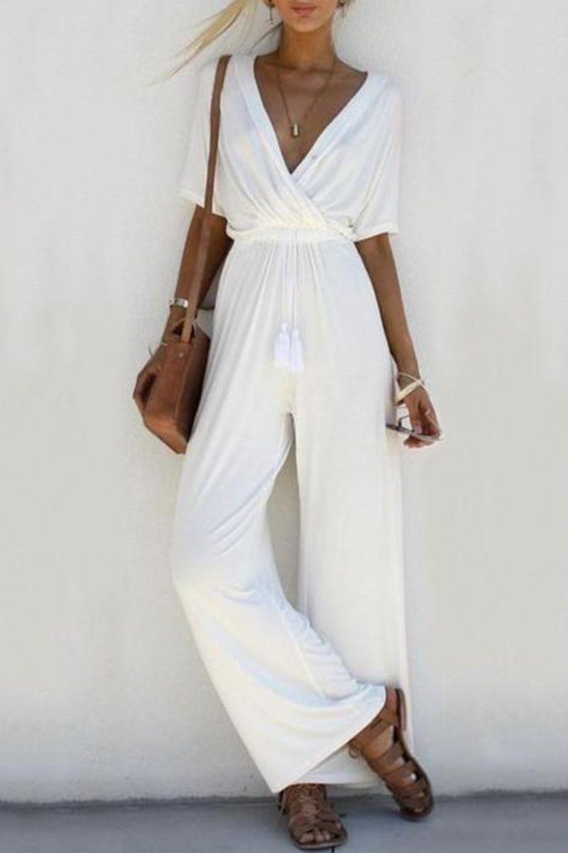 Renove o seu guarda-roupa de verão com este macacão sutilmente sexy com decote em V. A silhueta casual fará deste macacão a sua peça favorita para usar nas férias. Mangas curtas, calças largas e um cordão com franjas são os detalhes que fazem a diferença. É leve para que você possa colocá-lo na sua mala de mão para uma pequena viagem. Combine com as suas rasteirinhas para ficar confortável durante o dia todo ou crie um look elegante com o seu salto alto favorito.
