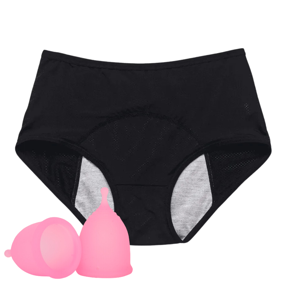 3x ou 5x Calcinhas Absorventes Protetoras + Coletor Menstrual de brinde (ou mais, dependendo da opção selecionada).