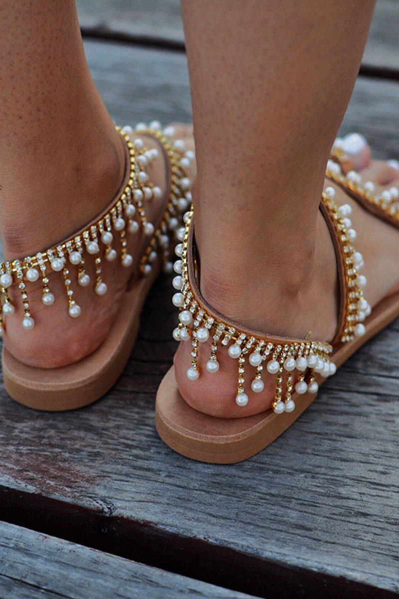 Sandália Rasteira Feminina com Pérolas e Cordão Decorado em Couro Celestial